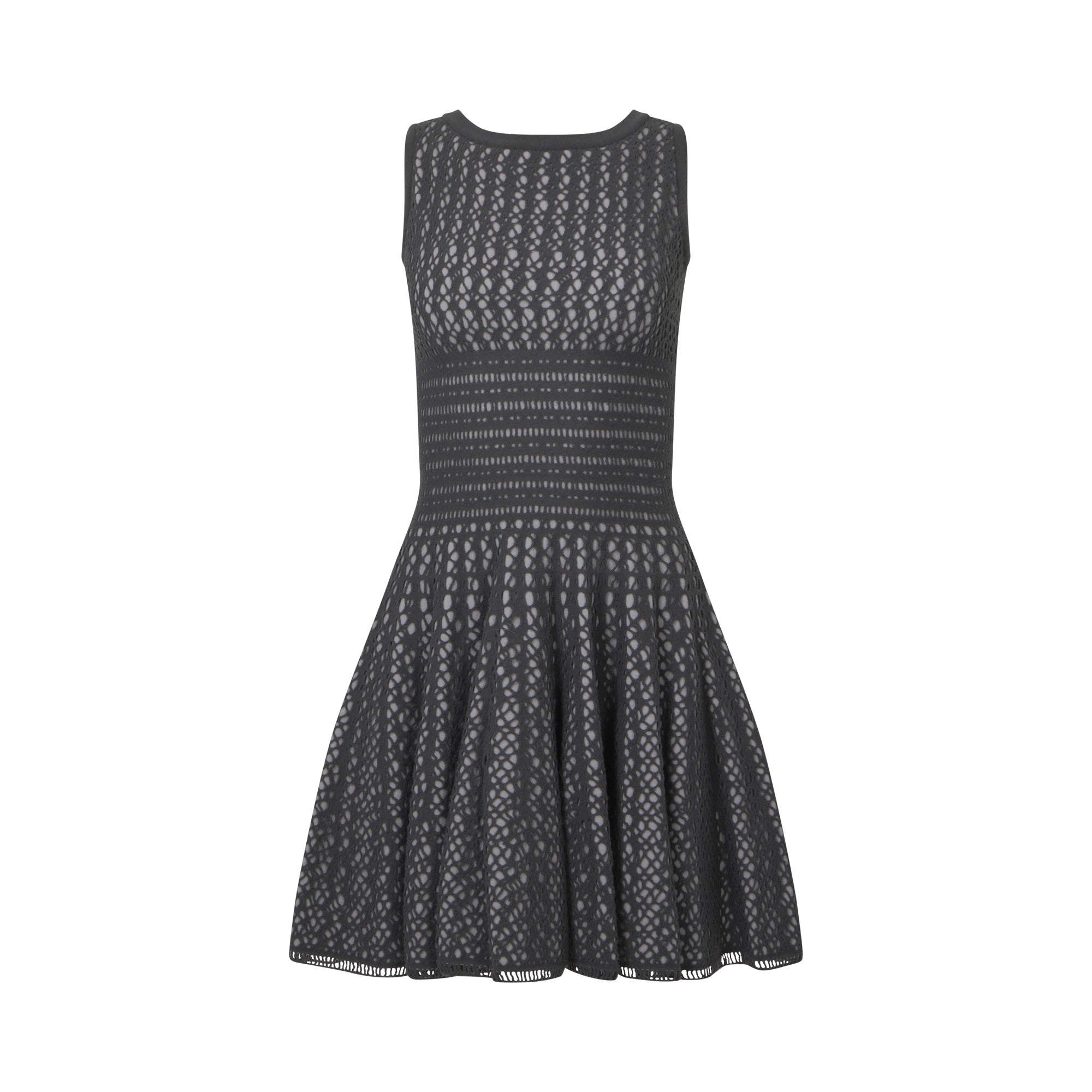Alaia grey virgin wool blend cut out jacquard fit and flared mini dress. It is sleeveless, A line