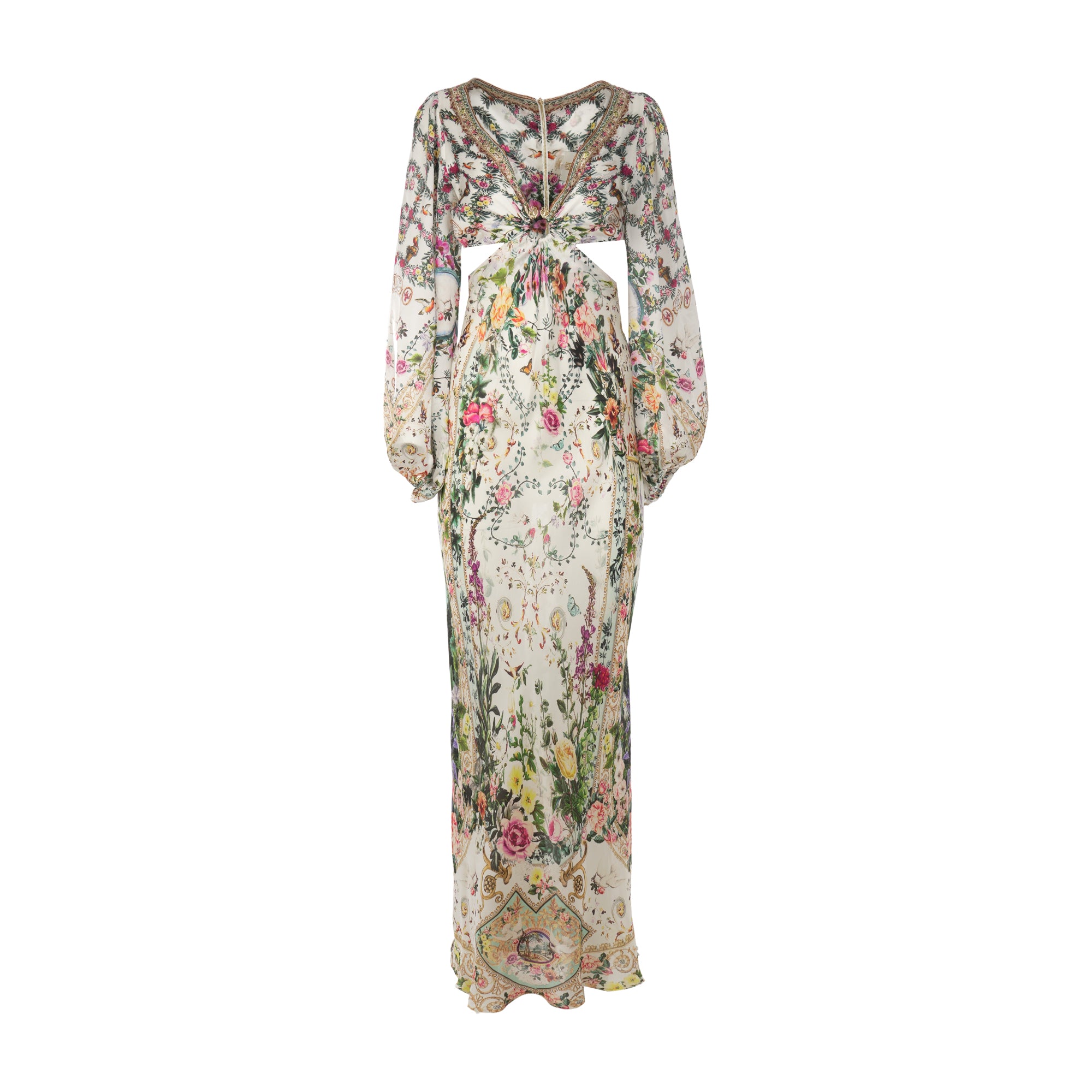 Camilla cutout embellished silk maxi floral dress. Closure zipped back