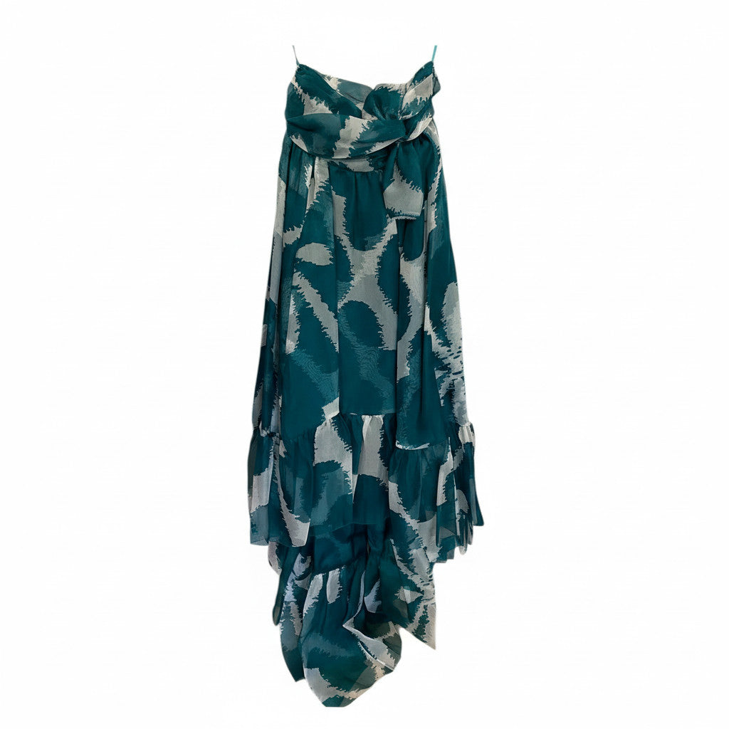 Elegant Diane von Furstenberg Lipari gown in a striking teal abstract print. This flowing maxi silhouette features delicate spaghetti straps, a softly draped bodice, and a waist-defining sash detail for a flattering, feminine shape.