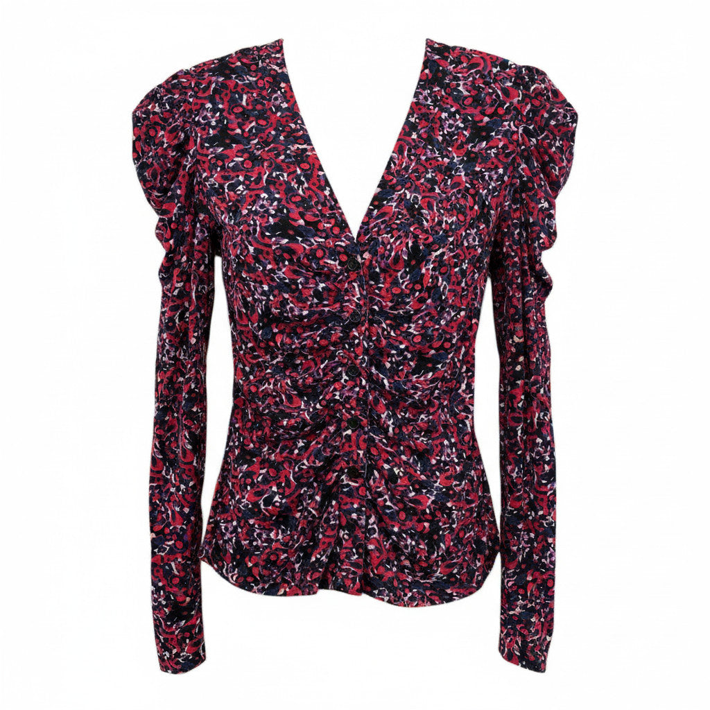 Bold Diane von Furstenberg matching reversible set featuring a vibrant blue and pink abstract print. The ruched button-front top with structured shoulders pairs with a fitted skirt for a striking, figure-flattering silhouette.