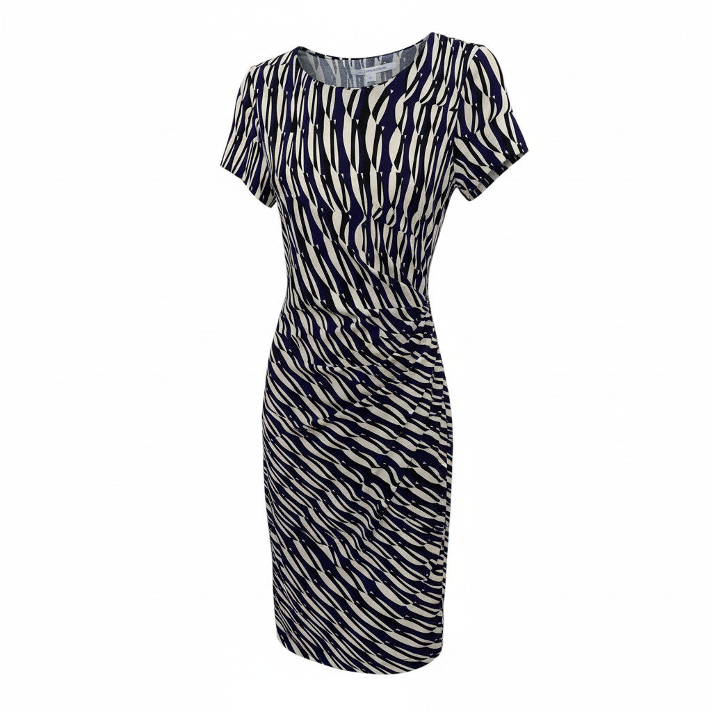 Stylish Diane von Furstenberg Zoe dress featuring a bold navy and white abstract pattern. Designed with a flattering draped silhouette, short sleeves, and a fitted shape that enhances the figure. A versatile piece suitable for both workwear and evening outings.