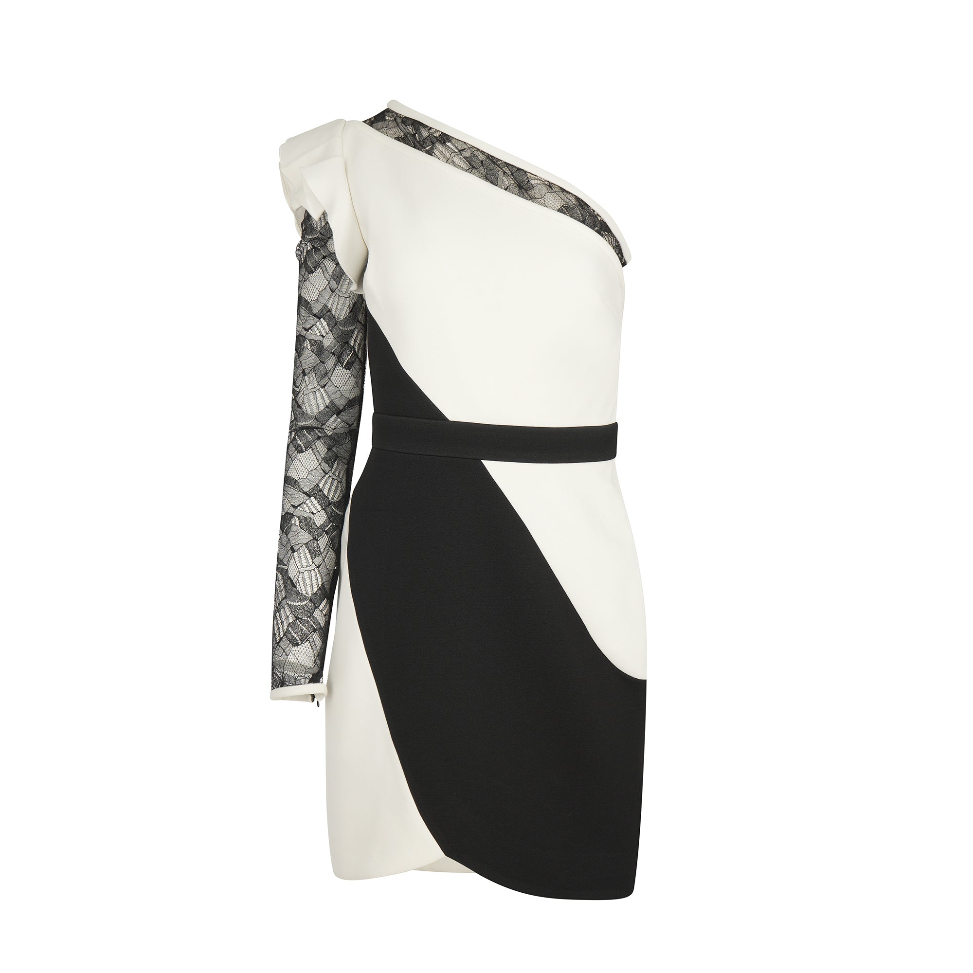 White & black one shoulder dress with black lace on one sleeve. Zipper on the side