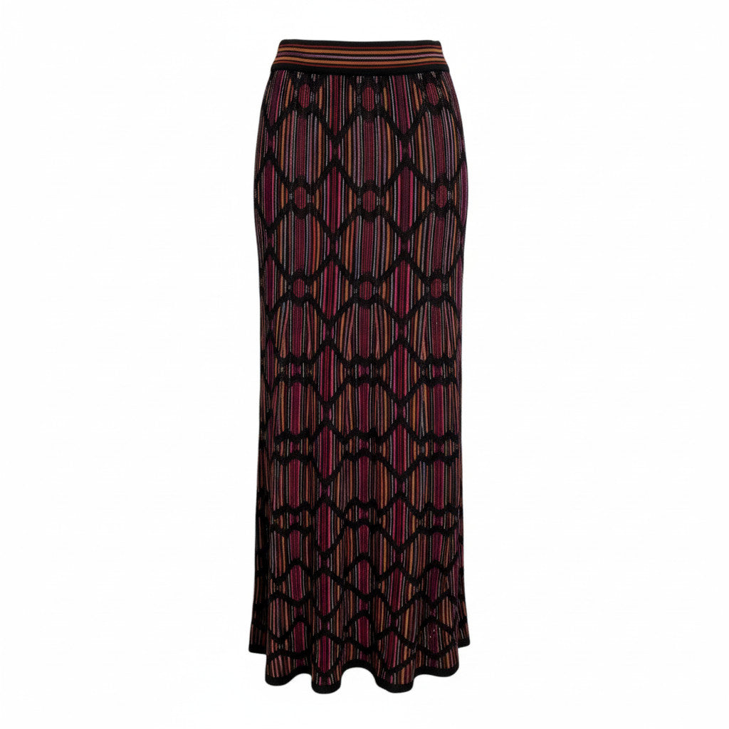 The Missoni knit long skirt showcases the house’s unmistakable craftsmanship through a richly textured multicolor design. Featuring a refined zigzag openwork pattern layered over fine vertical striping, this piece offers depth, movement, and visual sophistication. The fluid silhouette and stretch knit construction create a flattering, body-skimming fit, while the elasticated waistband ensures comfort and ease. A timeless statement piece, it embodies Missoni’s signature balance of artistry and wearability.