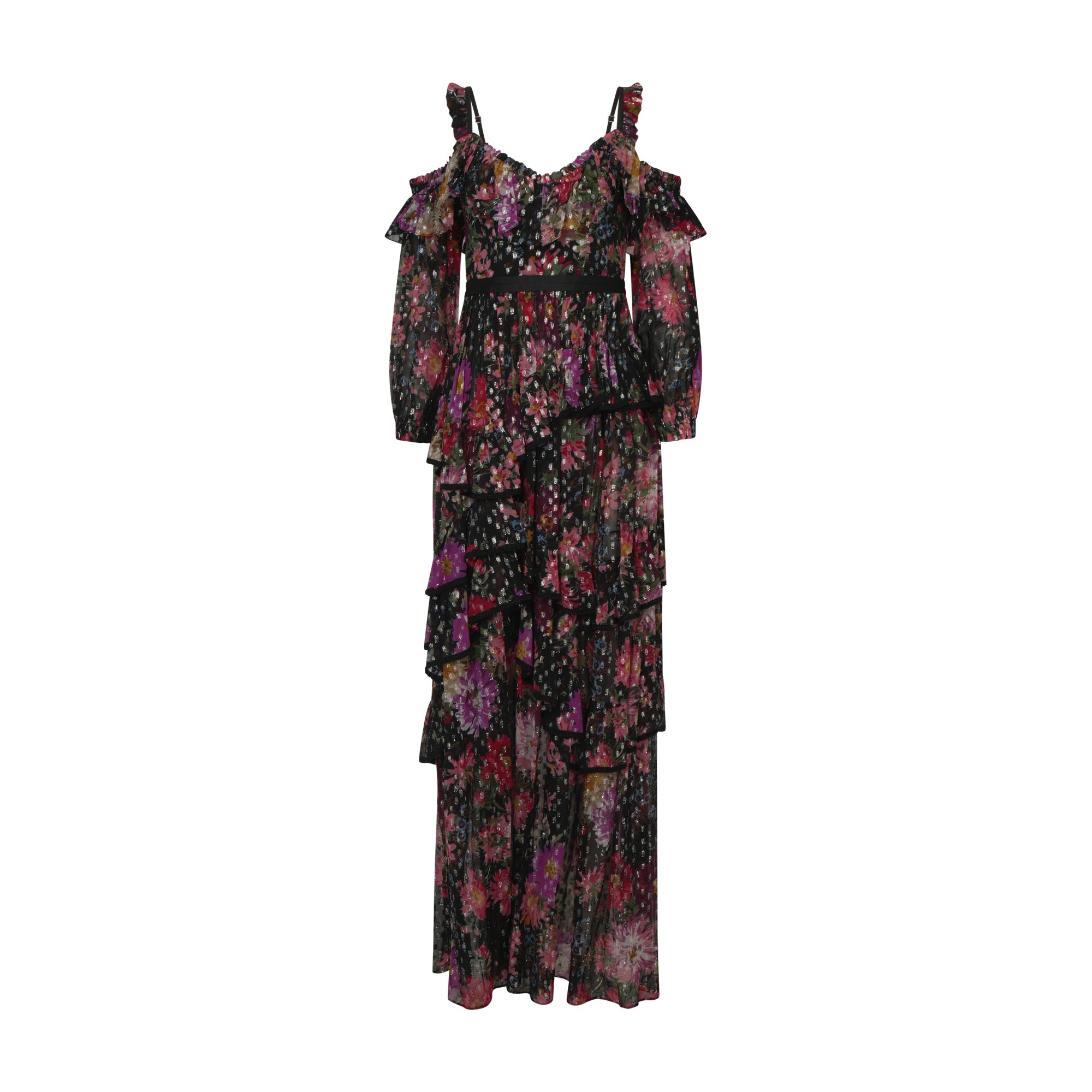 This style of dress features ruffles, long sleeves with shoulder cutouts. V neckline and a flowing tiered skirt