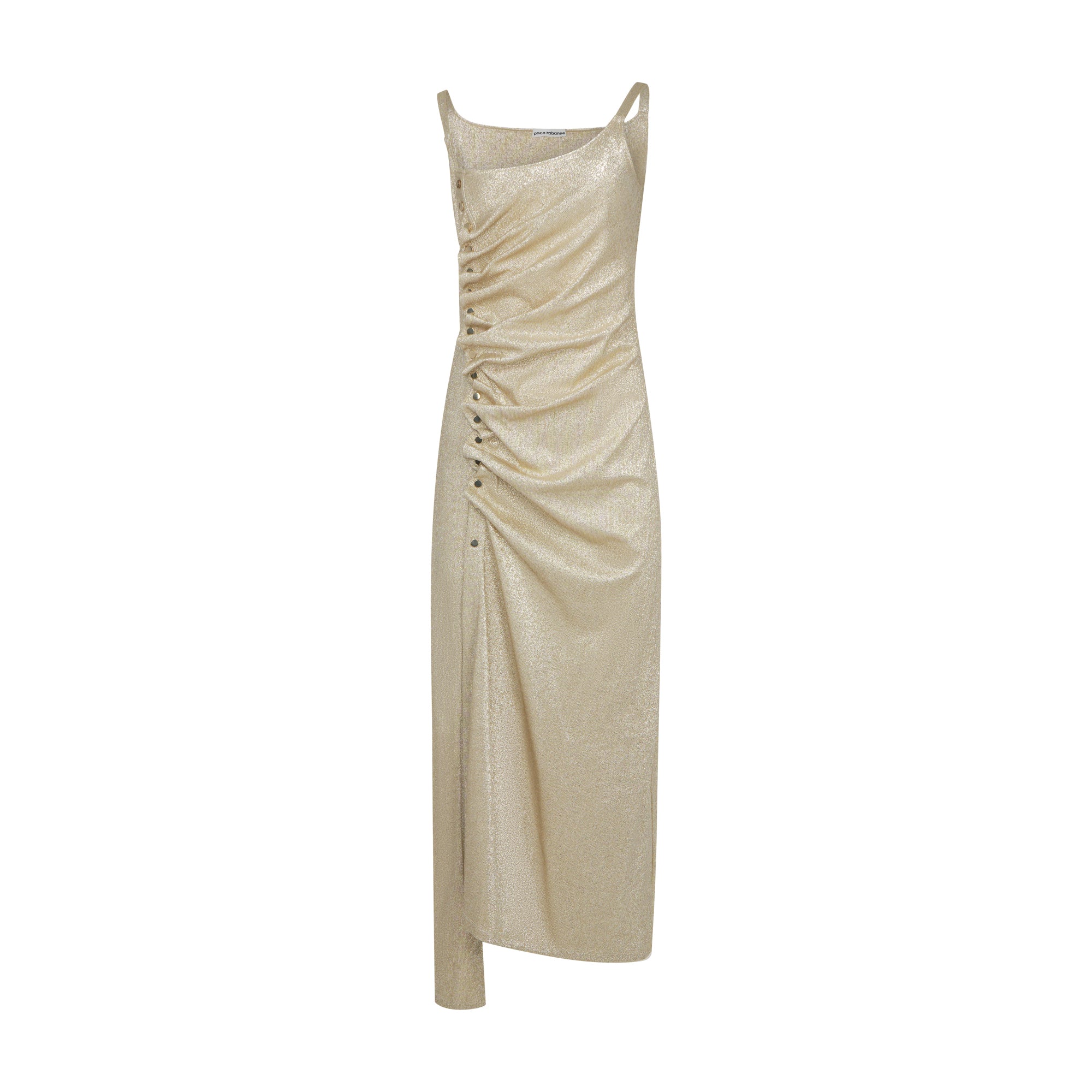 Lurex jersey side button gathered dress in shiny gold