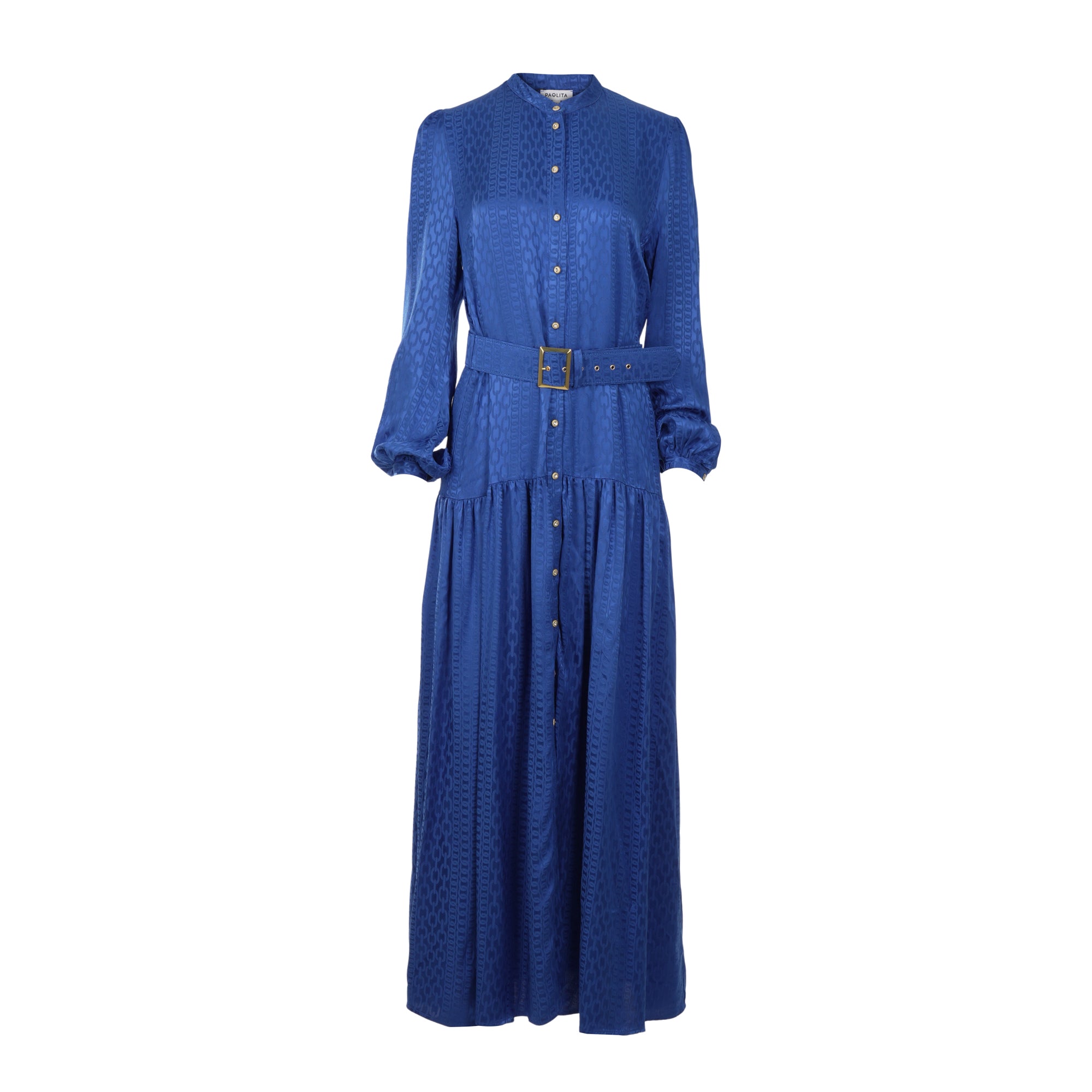 Beautiful Blue long dress with chain design and round neck. Closure with front gold buttons and a belt.