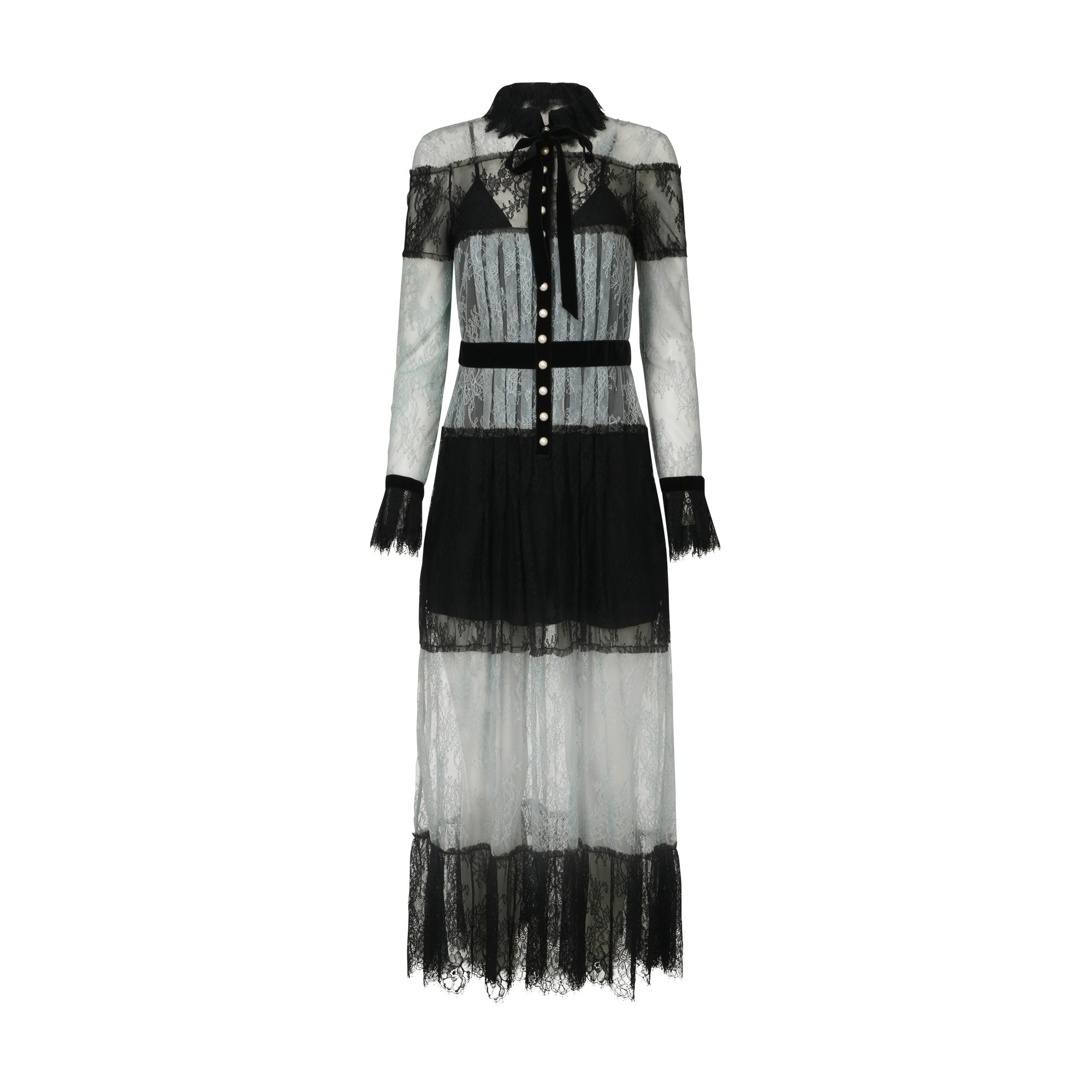 Black and light blue lace dress with a high neckline with a black velvet tie, bow detail. A button up front closure featuring white pearl buttons. A fitted black velvet waistline.