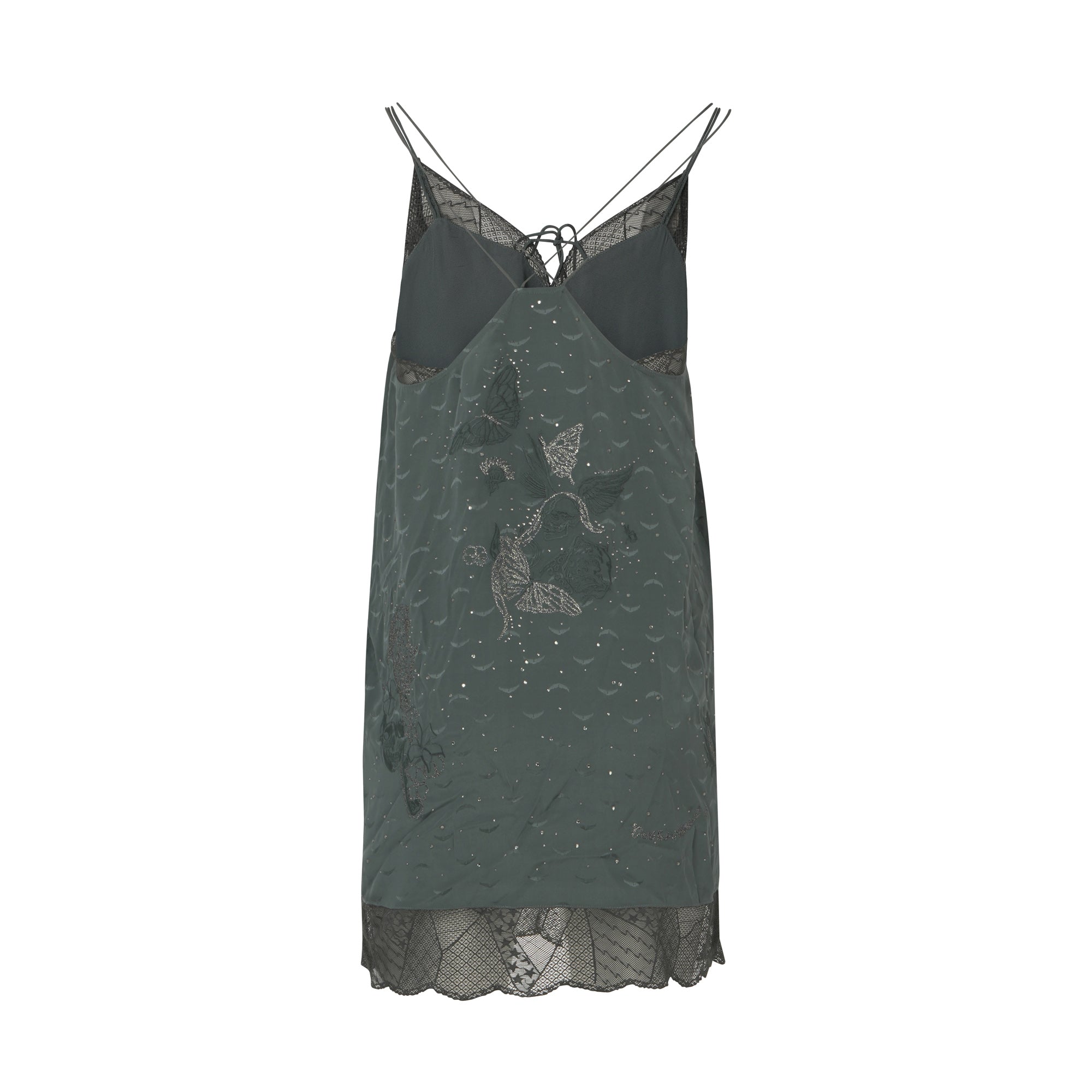 The slip-on dress shown in the image is the Calissa wings-jacquard mini dress. Petrol color. Delicate lace trim at the hem and neckline. Spaghetti straps that cross at the back