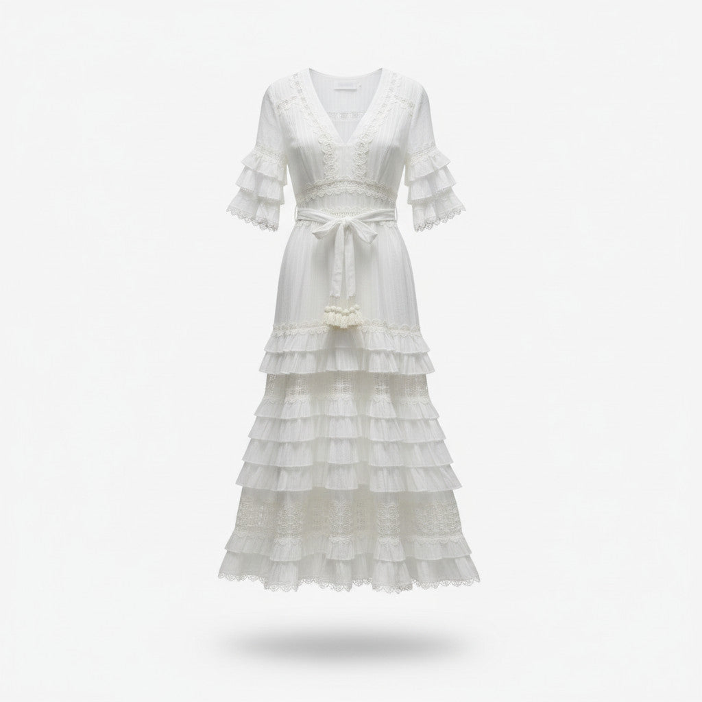 Beautiful Zimmermann white maxi dress featuring intricate lace detailing, soft pleating, and a tiered silhouette. Designed with a flattering V-neckline, short sleeves, and a removable waist tie belt with tassel accents for a feminine, bohemian-inspired look. Lightweight and airy, this dress is perfect for summer events, vacations, or special occasions.