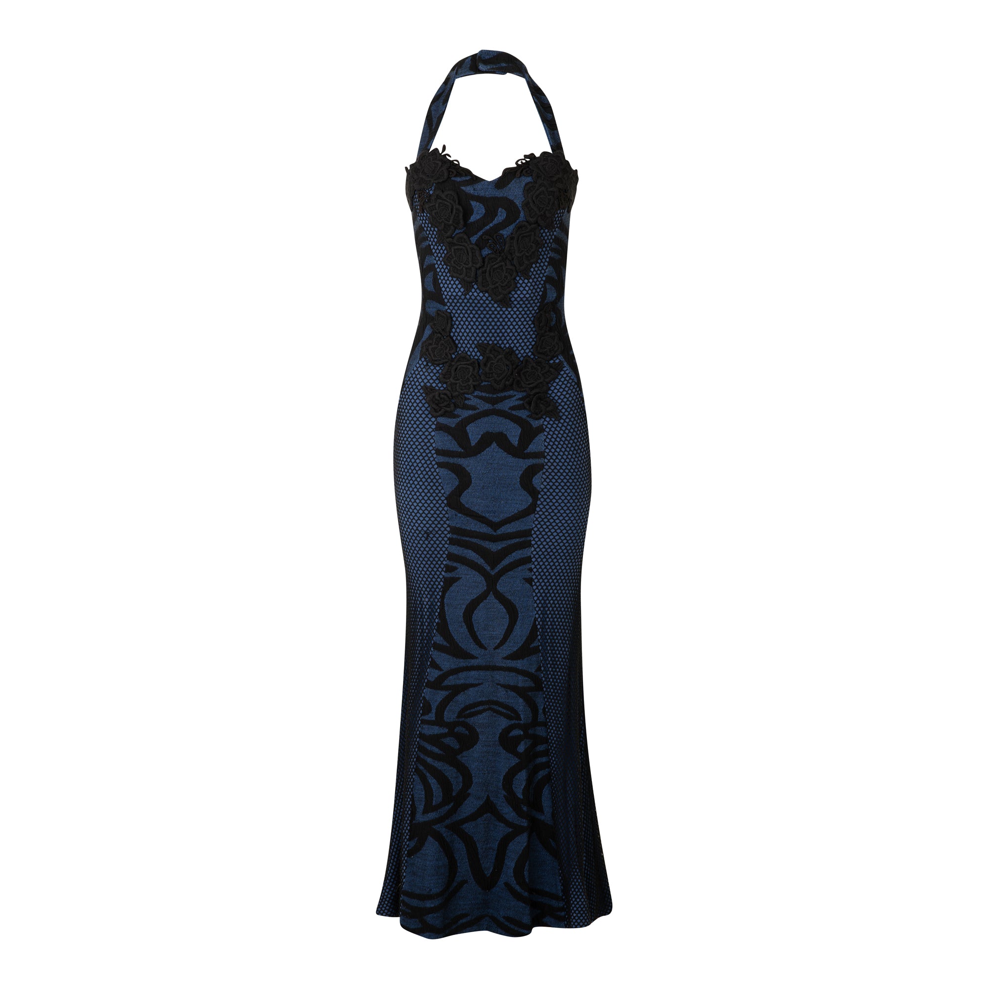 Vestido largo azul oscuro y negro con abertura en la espalda y escote en forma de corazón.