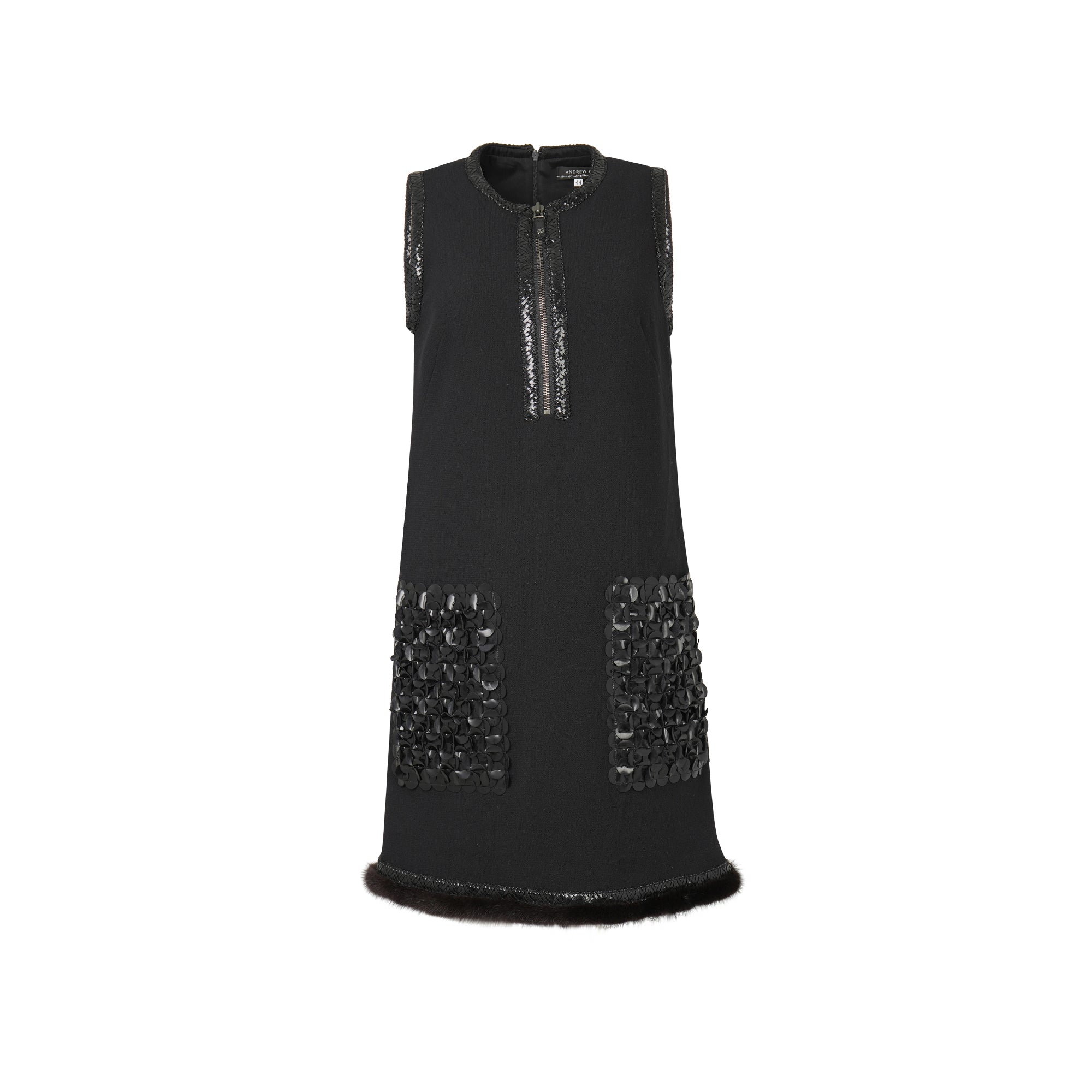 Vestido negro bordado hasta la rodilla, sin mangas, con bolsillos grandes y piel en la parte inferior del vestido, cremallera en la parte delantera.