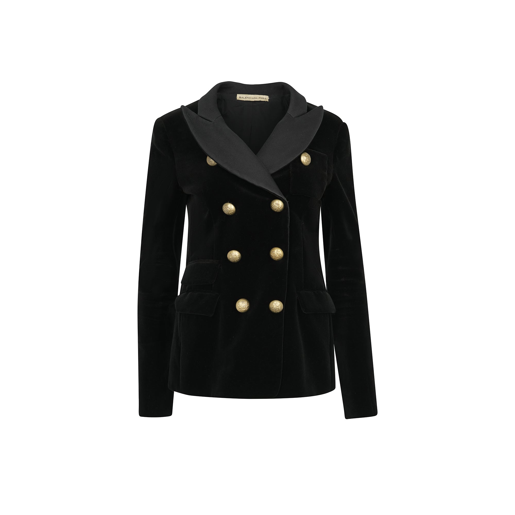 Magnífica chaqueta cruzada de terciopelo negro con botones dorados