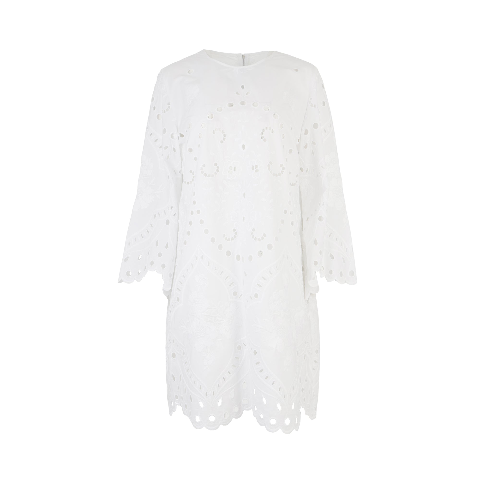 Dolce & Gabbana adds a minimalistic twist to the brands SS22 collection. Intricate detailing is still seen on this long sleeve dress through cut-out detailing and an embroidered design in a tonal colorway. It has a long zipper in the back