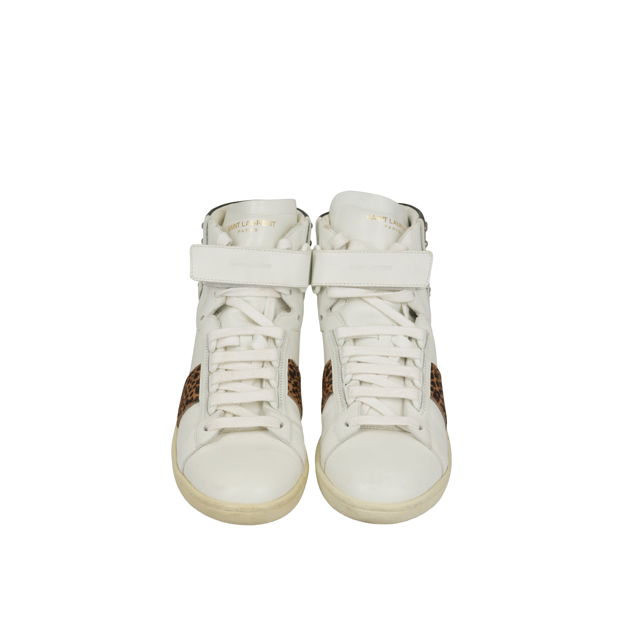 White high top sneakers with pony hair animal print on the sides and silver studs at the back. Round toes