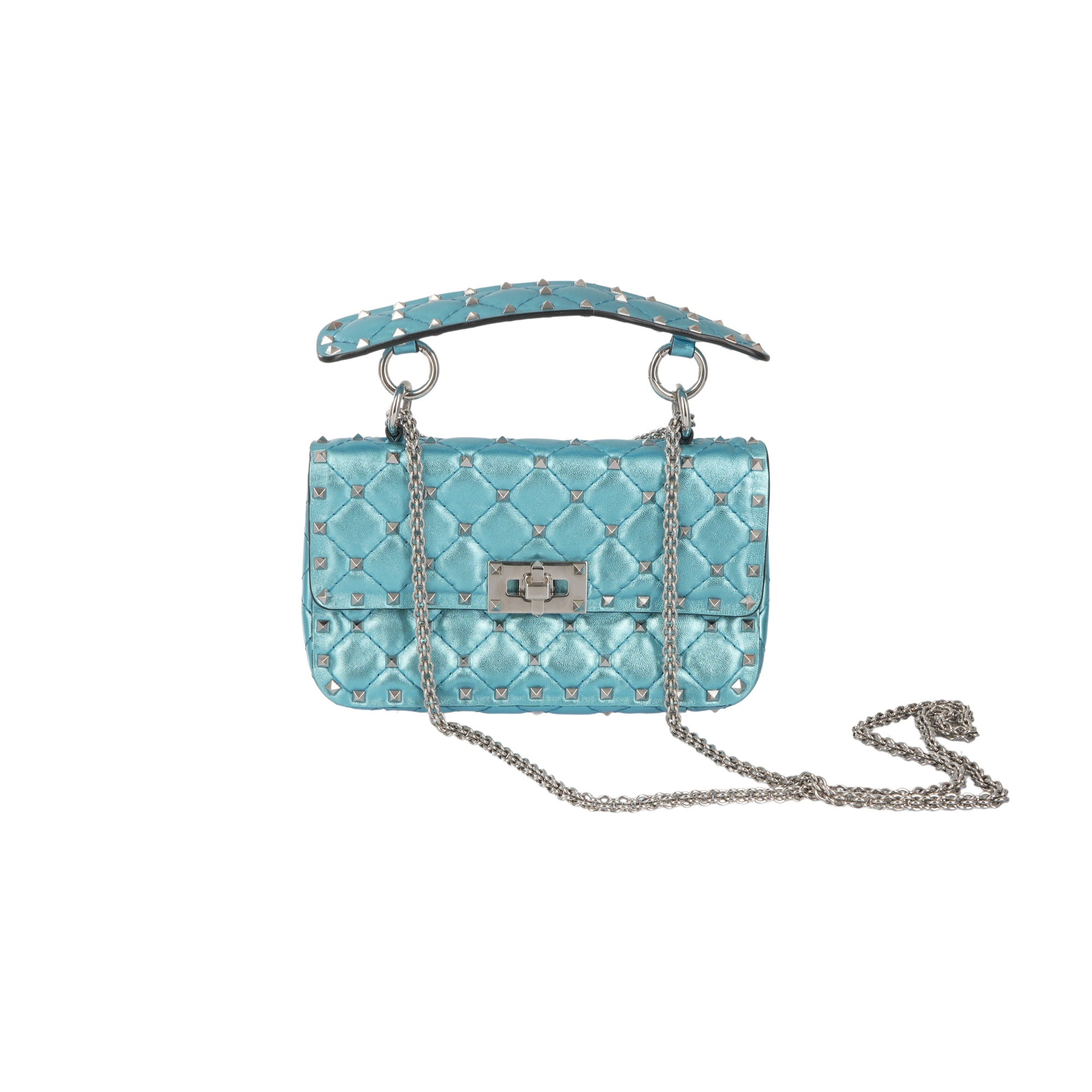 Metallic Lambskin small rockstud spike shoulder bag in State Blue. This chic cross-body bag is beautifully crafted of metallic blue leather with silver pyramid shape studs throughout. The bag features a silver chain shoulder strap, a top handle with silver studs. It has a red leather inside pocket.
