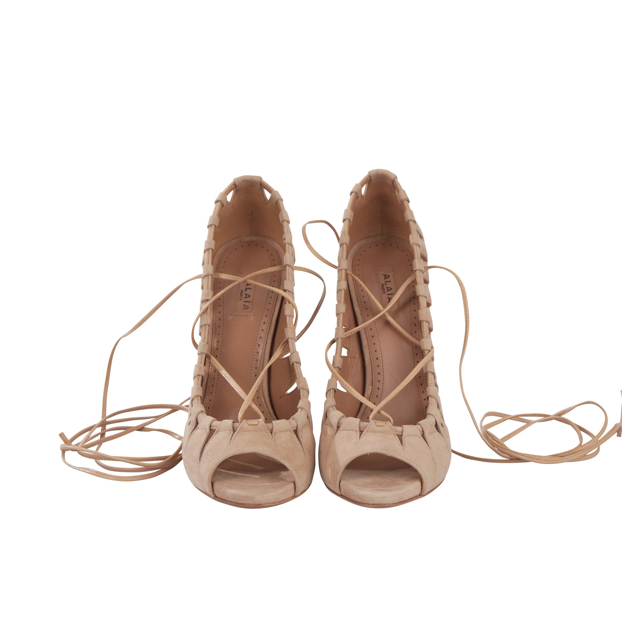 Strappy suede cut out peep toe heels beige color.