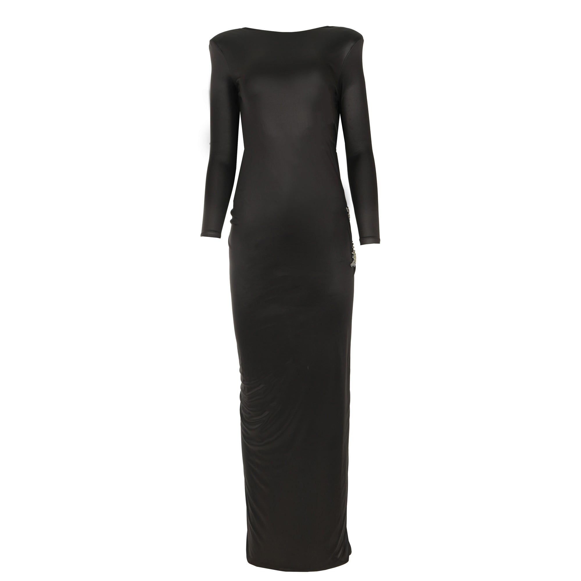 Black long open back dress with long sleeves. Back slit, silver embroidered applique on the left side. Padded shoulders
