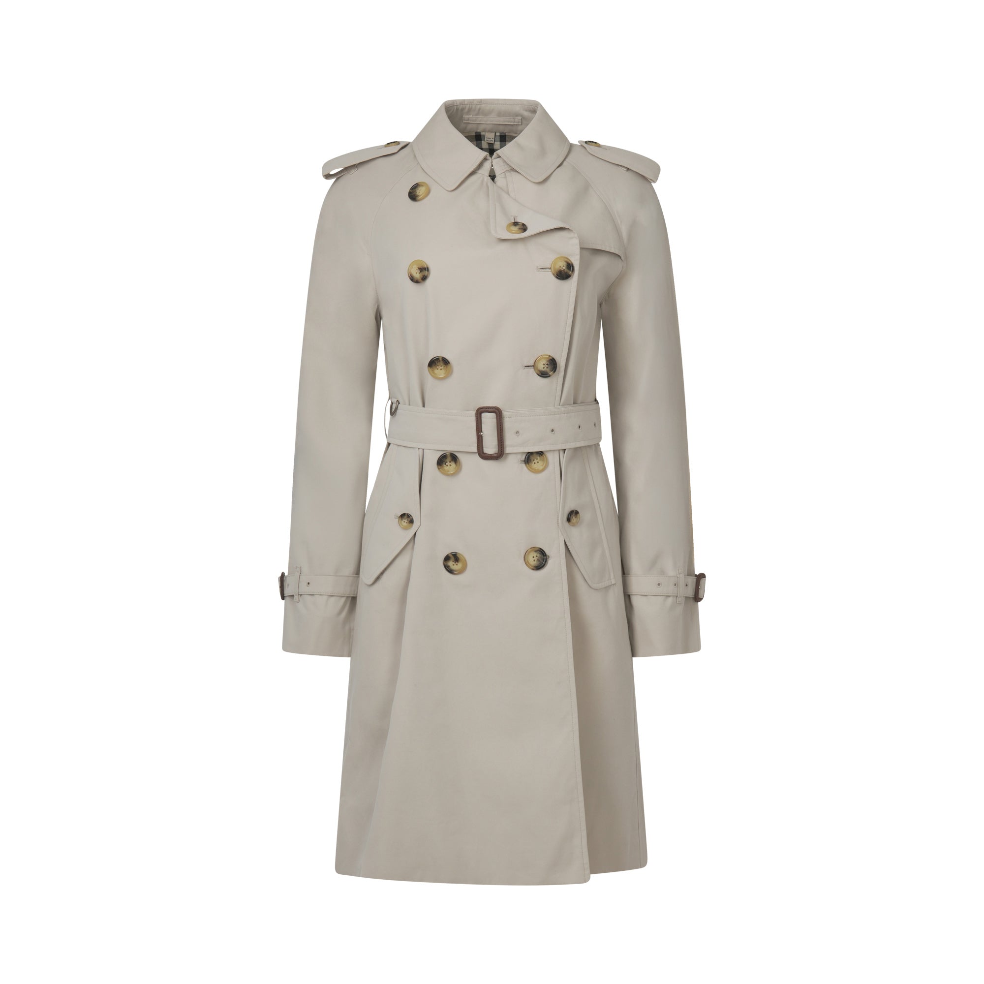 This is a classic and iconic piece known for its timeless style and functionality. The coat features a double-breasted button closure, a belted waist and belted cuffs. Beige color