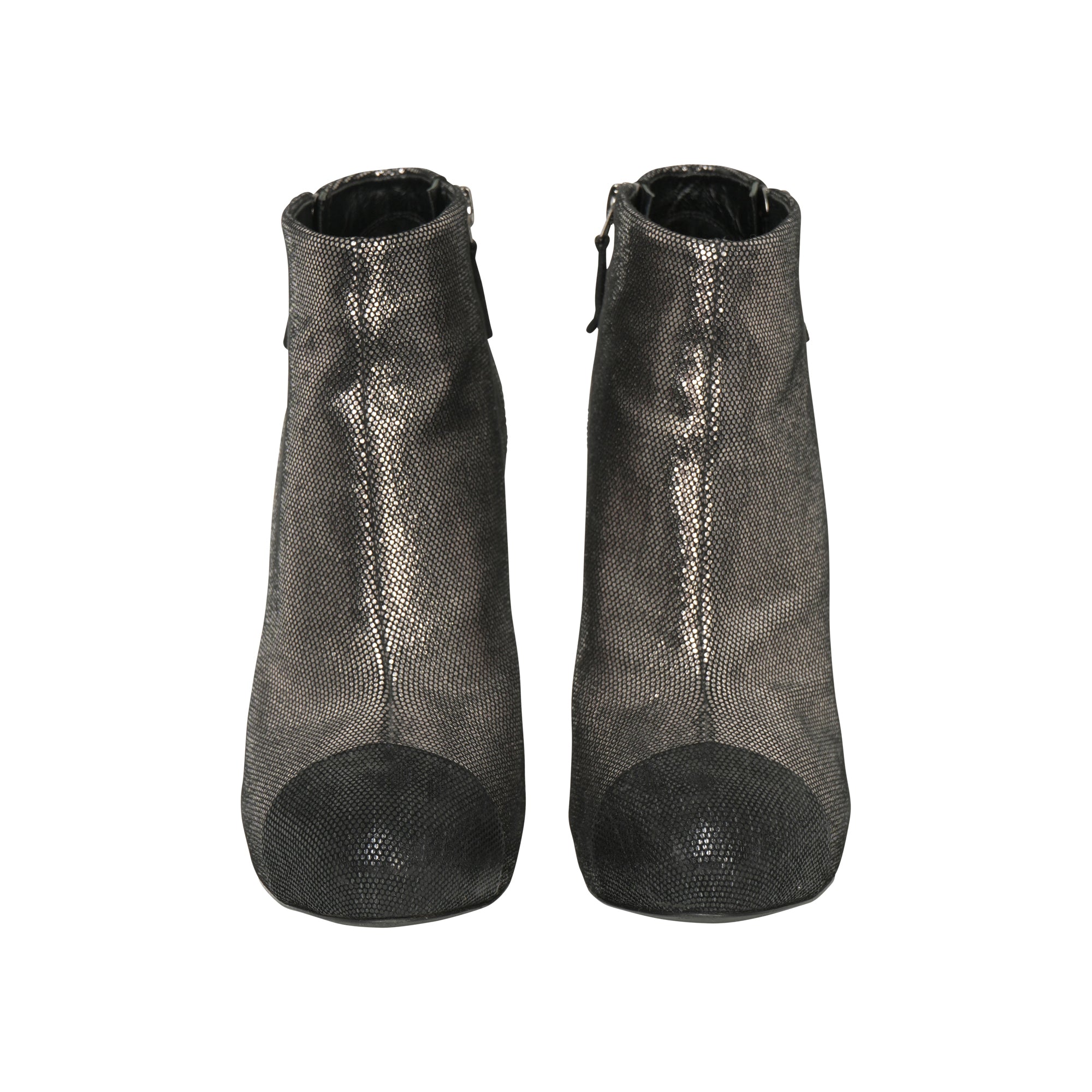 Metallic silver leather cap toe ankle boots with a side zip closure and a 4-inch heel.