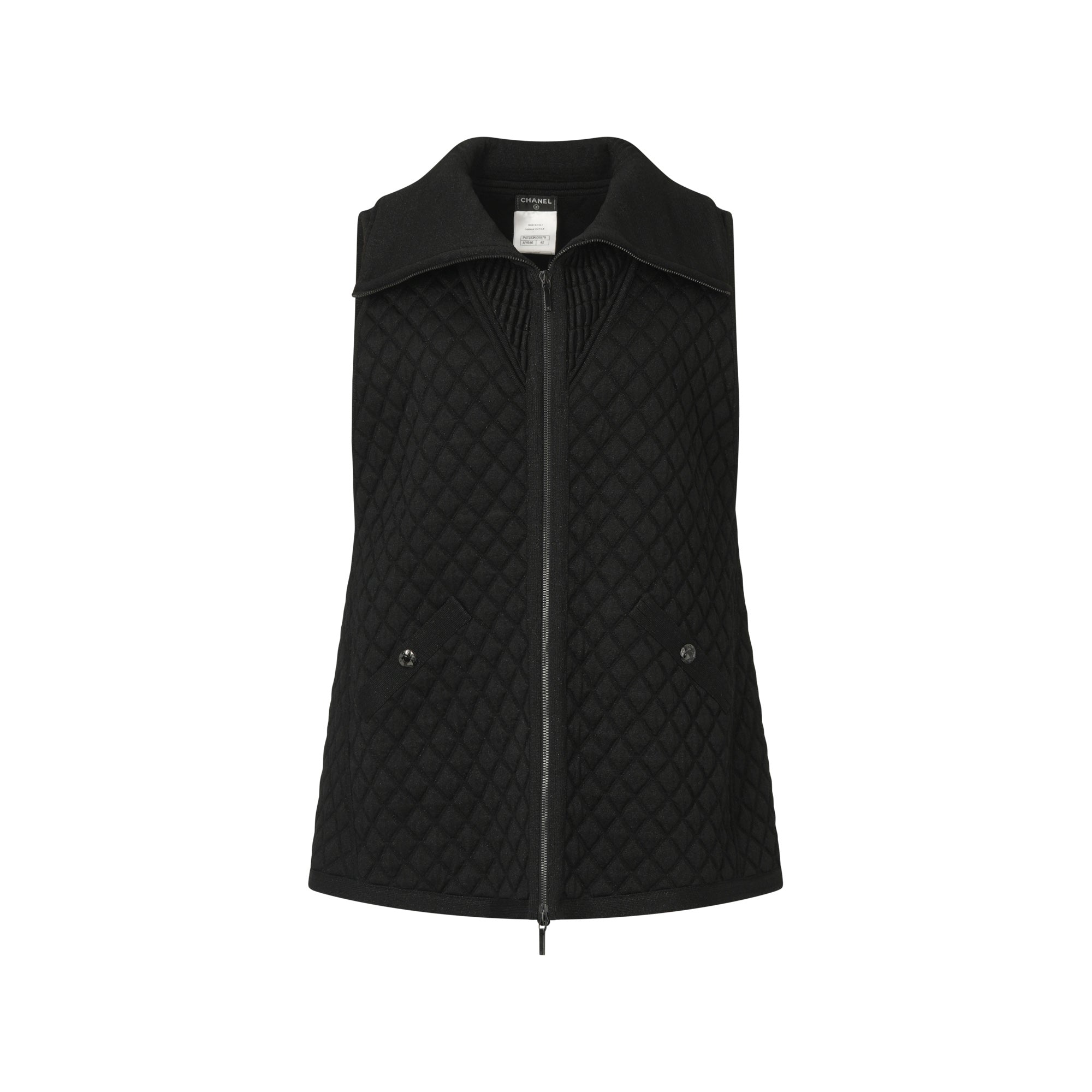 Quilted flared sleeveless skater vest. It features a stand-up collar and a front zip closure