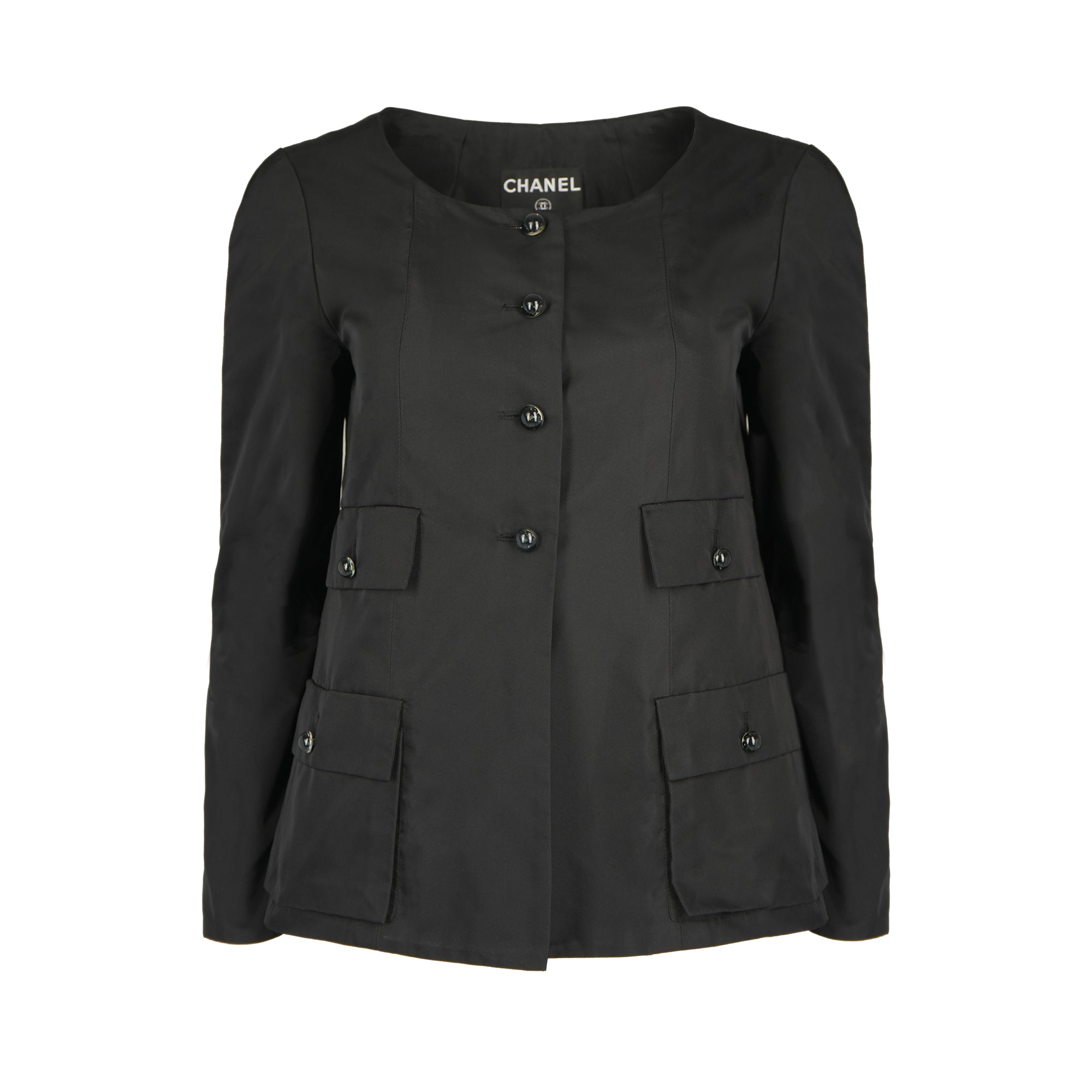 Beautiful black round neck silk blazer with four buttons in the front and four pockets. At the back four buttons on each side.