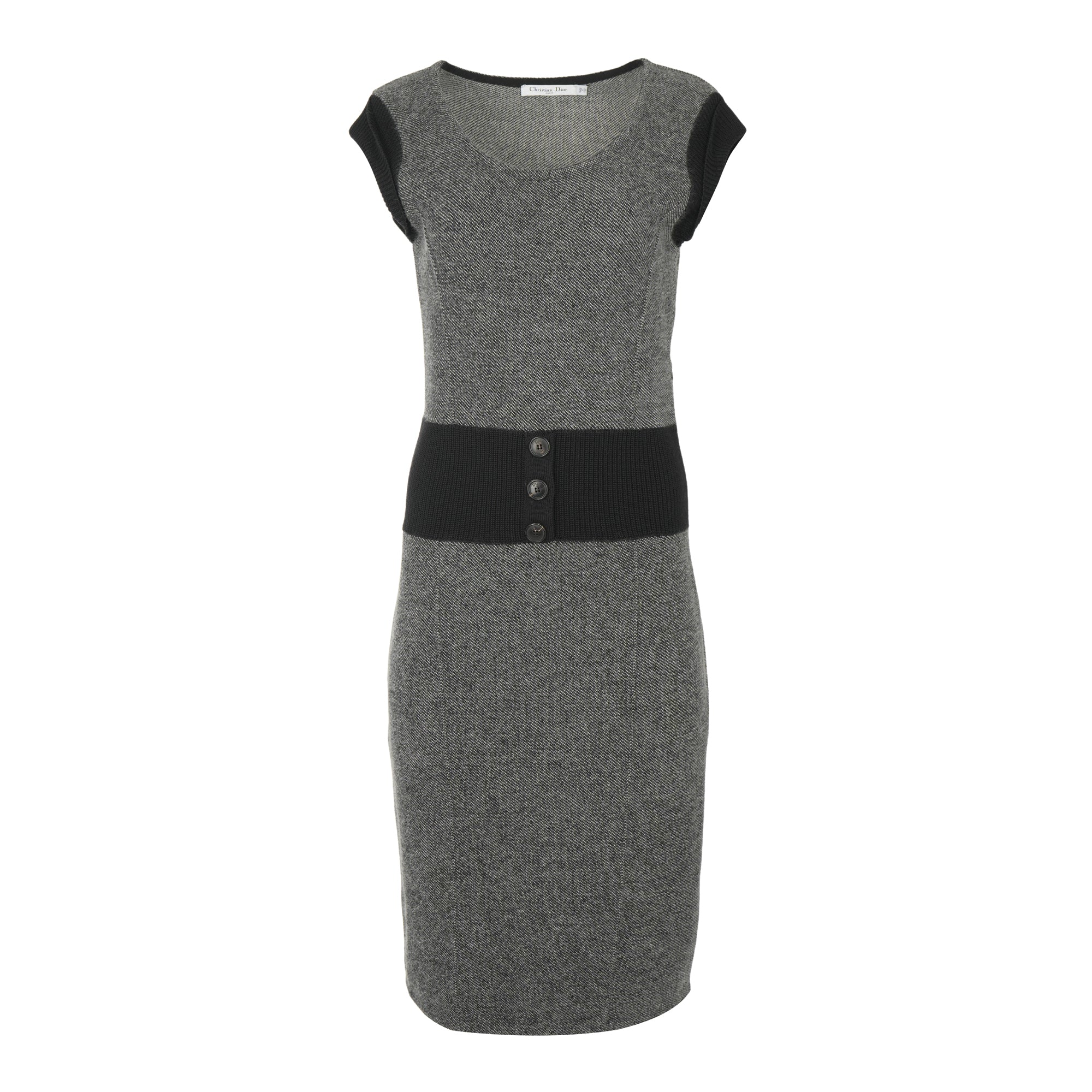 Grey knit mid length dress. Black resin branded buttons on the high belt. Black rib-knit folded French sleeves and belt. Round neckline. Zip closure on the left side seam.