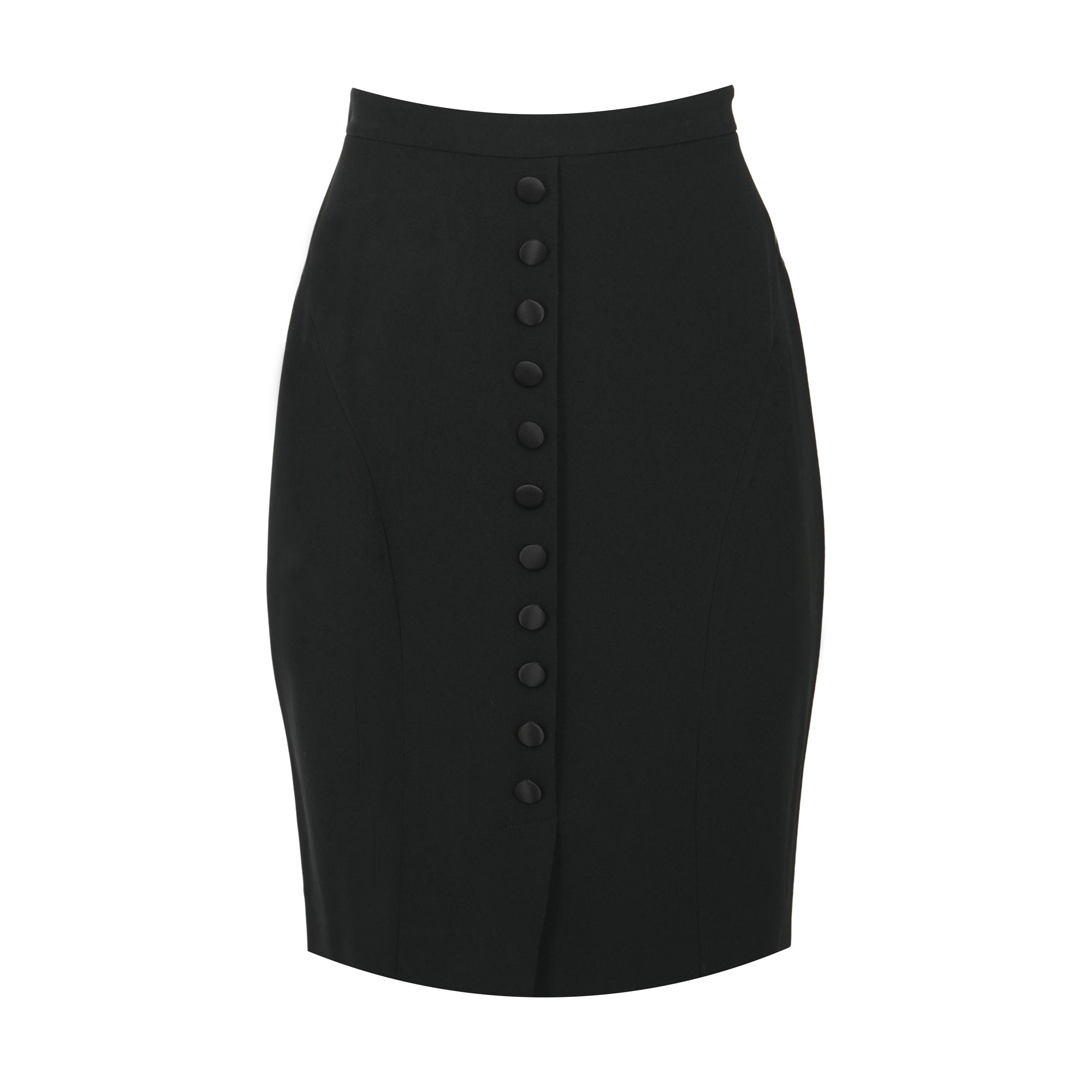 Black knee length skirt with satin buttons in the front and zipper at the back
