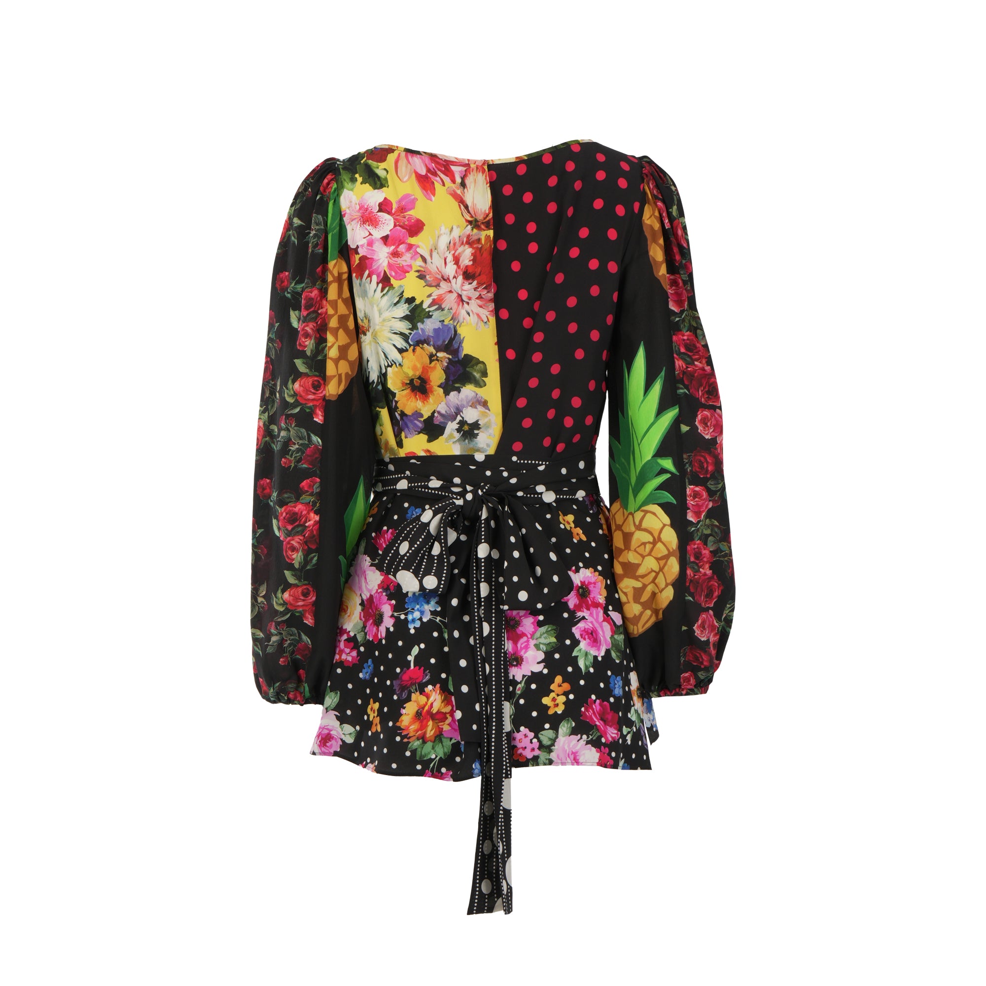 This blouse with its patchwork detailing in fine silk crepe de chine fabrics its beautiful. Has a round neck with long sleeves with stretch cuffs. Includes a fabric belt. Keyhole closure at the back with press-stud fastening.
