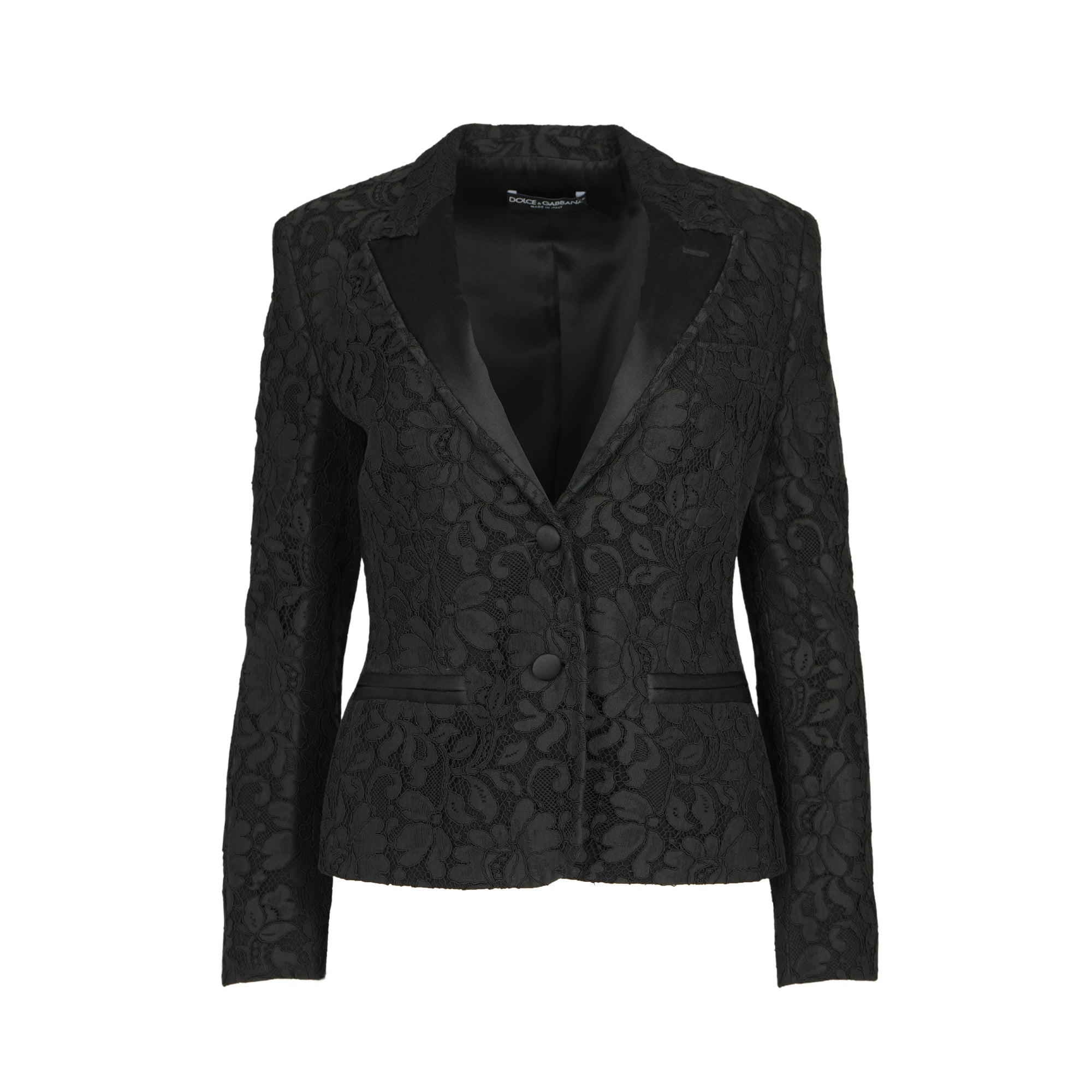 Black lace blazer with satin buttons