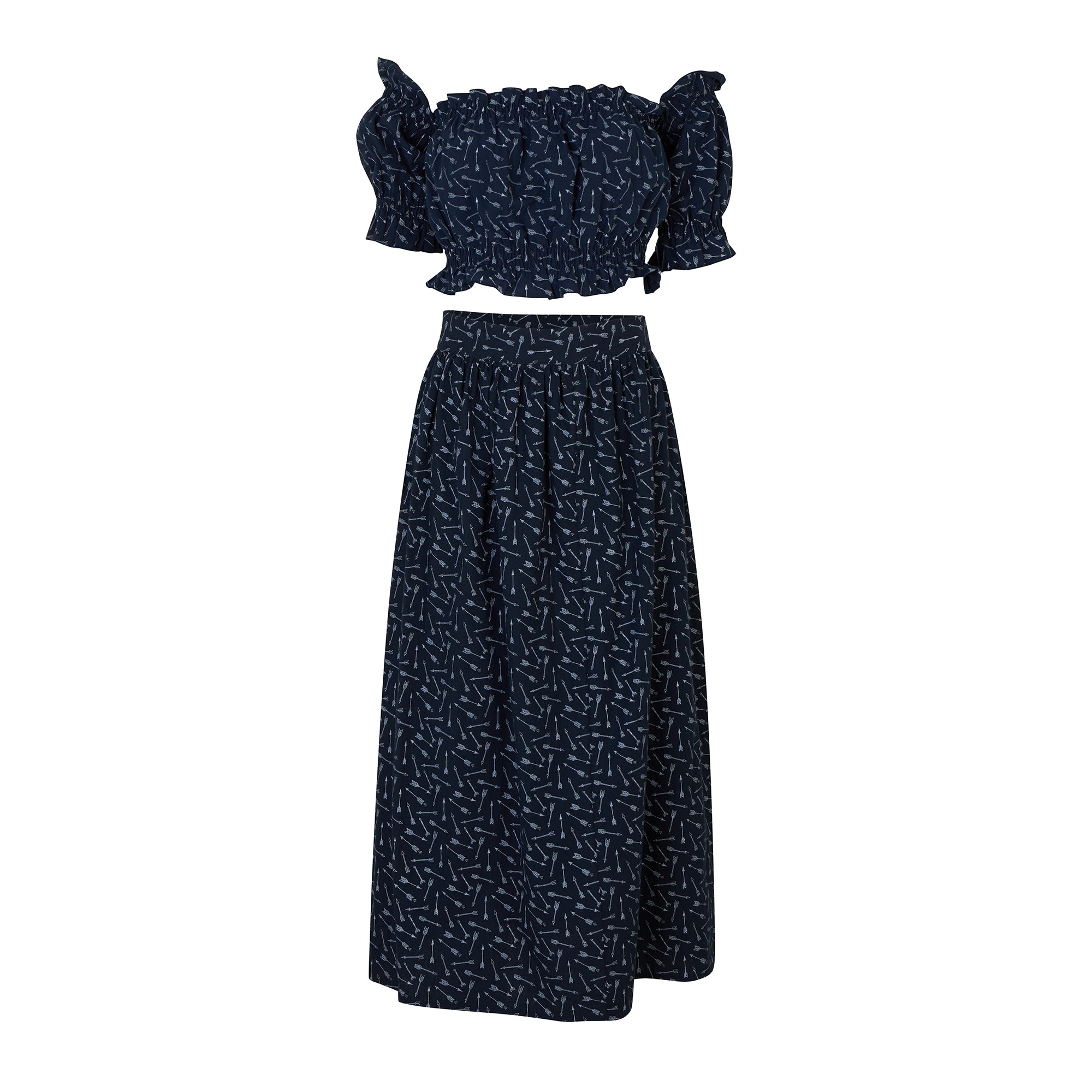 Navy blue with white arrows prints, off the shoulder crop top and midi skirt