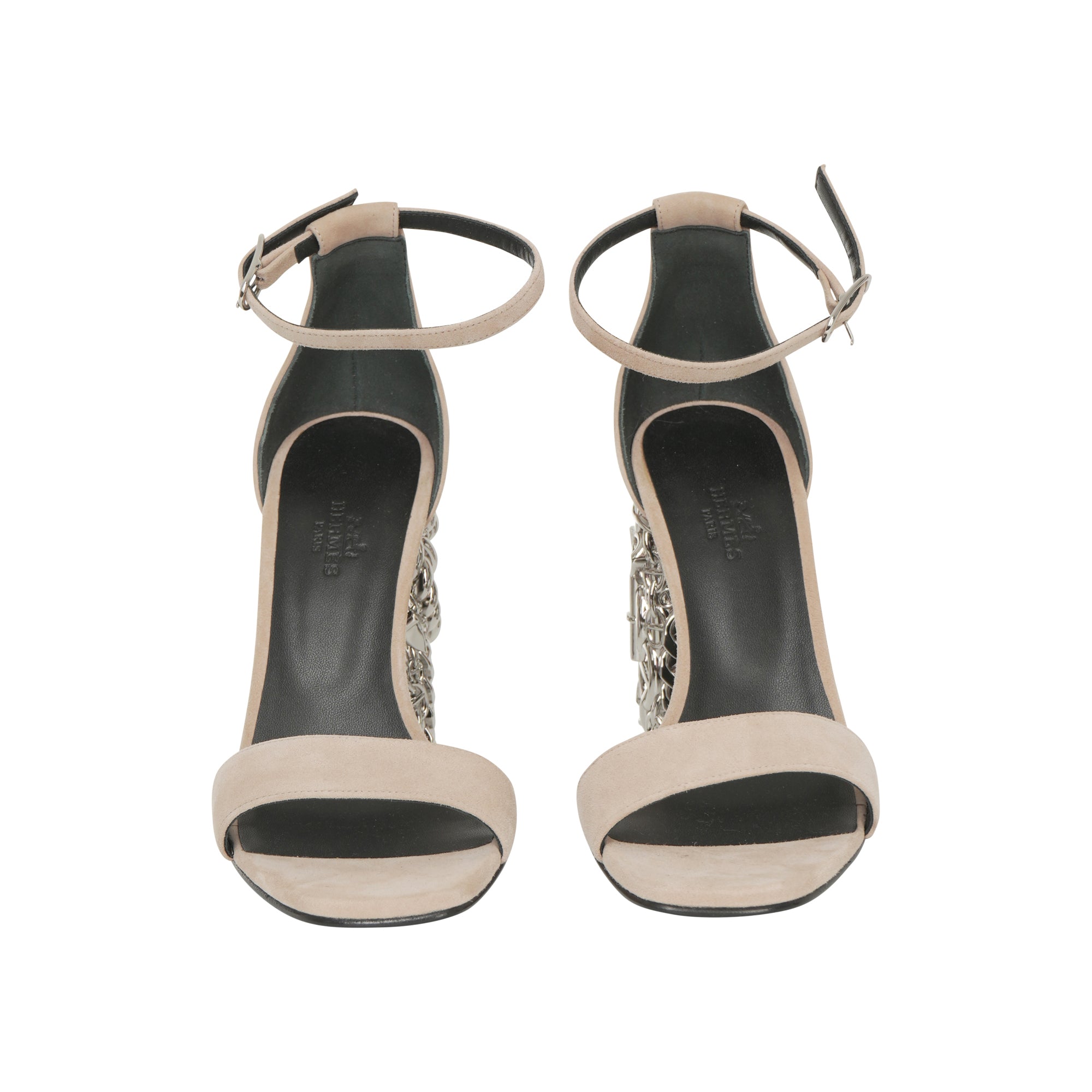 This is a pair of Hermes Glam 105 sandals in beige suede with a unique block heel decorated with a silver metal Chaine d' Ancre chain relief pattern. Ankle strap with a palladium-plated buckle closure.