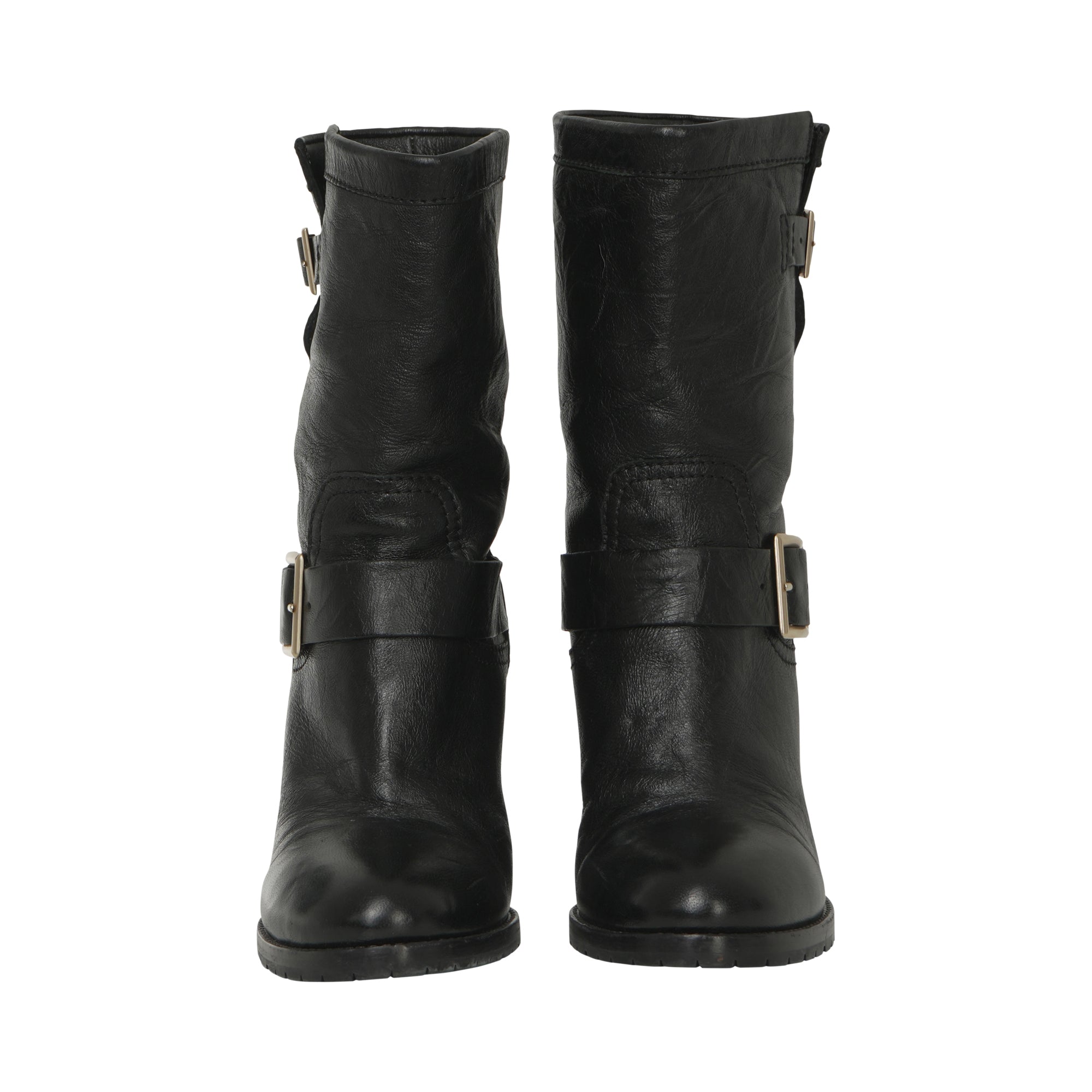 This Jimmy Choo black biker boots feminizes the look with an almost 4" stacked chunky heel . Golden buckles.