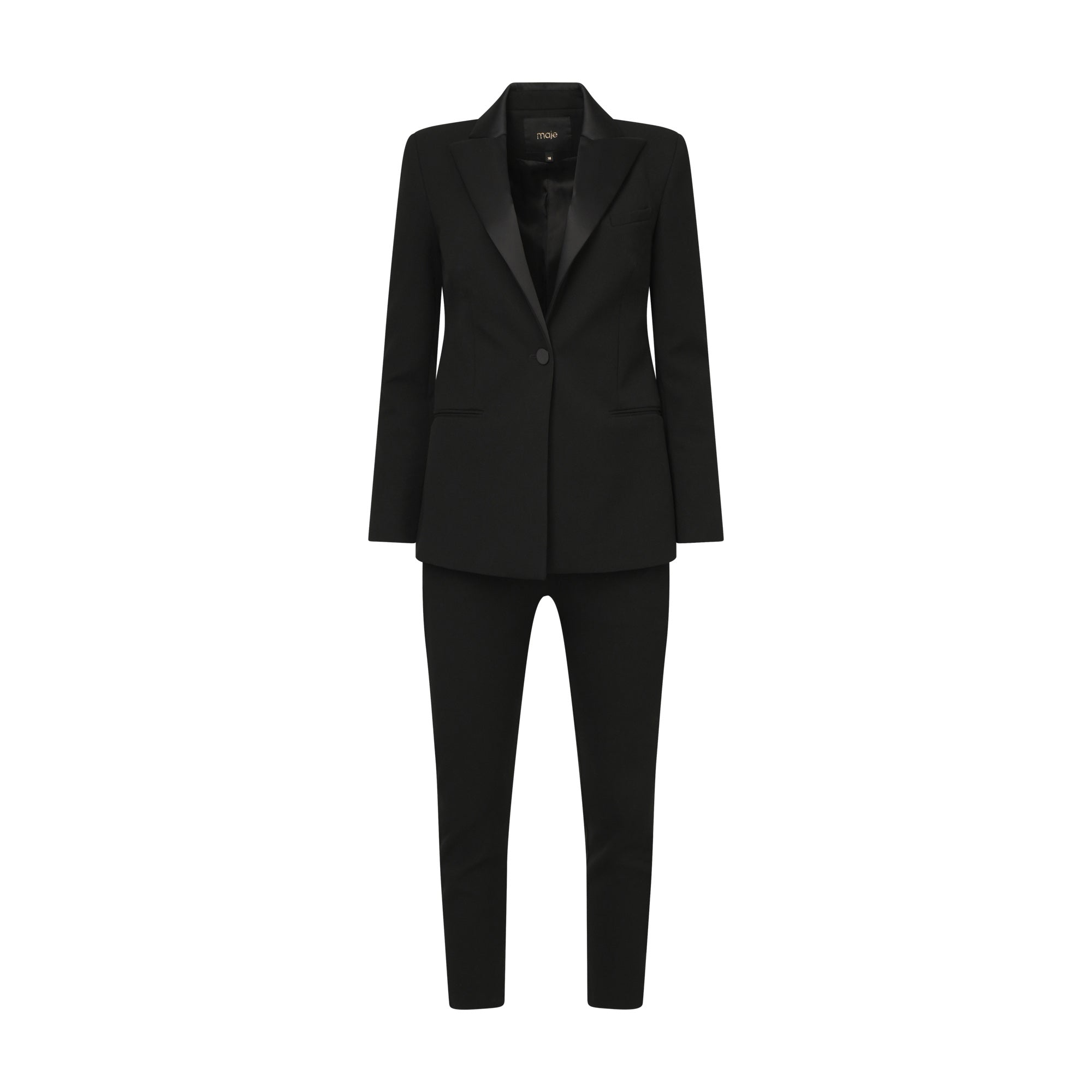 Maje Vaco Satin Lapel Blazer with single button closure with fitted pants.