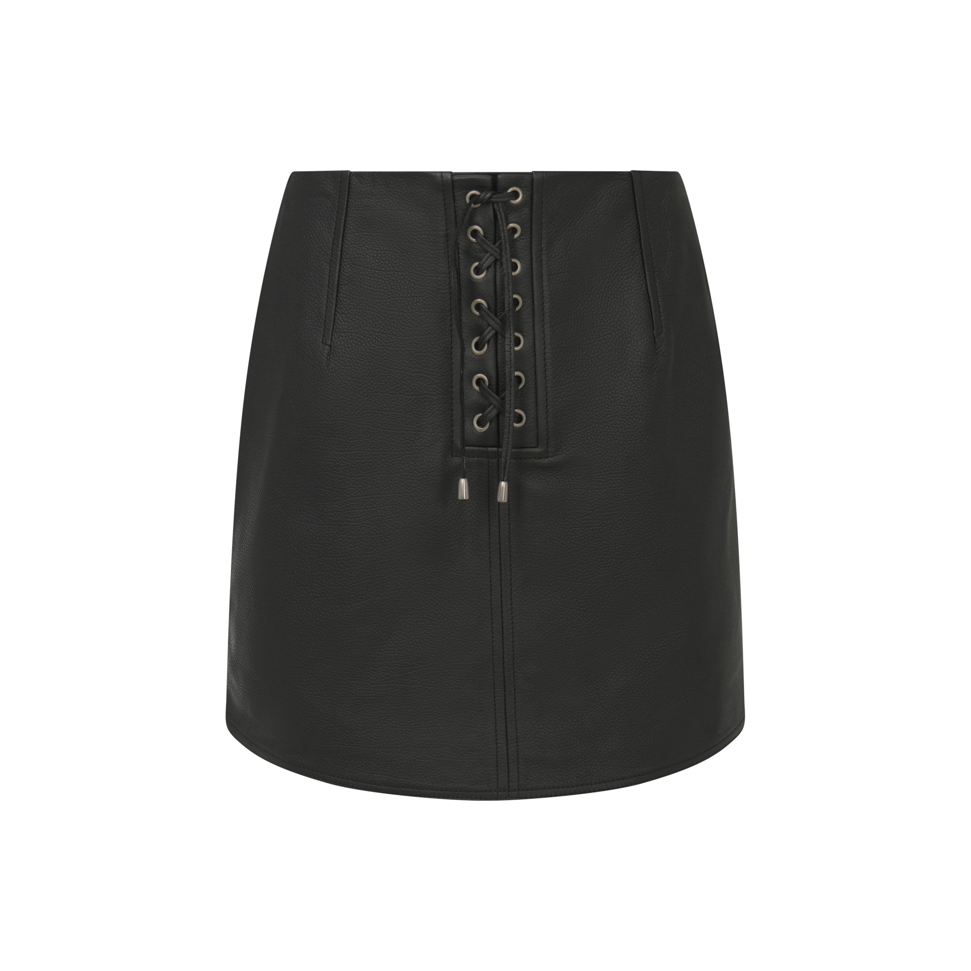 Black leather mini skirt with zipper at the back and in the front Criss cross closure.