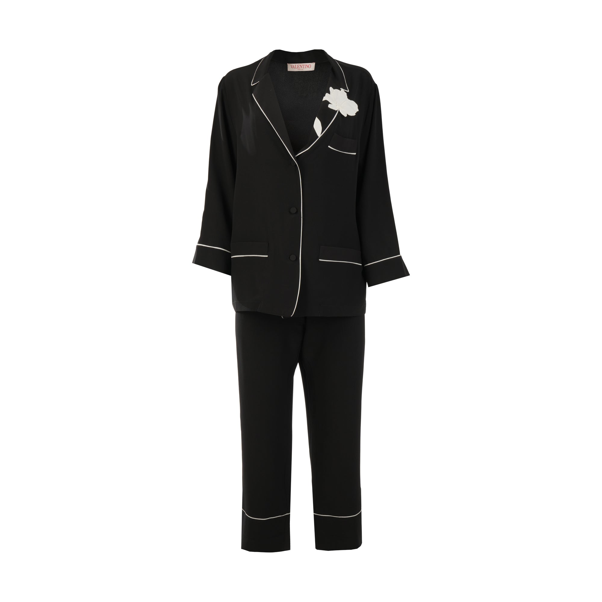 Valentino Black Pajama style set. The white trim makes the set it very elegant and the white flower applique. Pants have elastic waist. The pants have side pockets and on one side it has a white flower applique like the shirt.