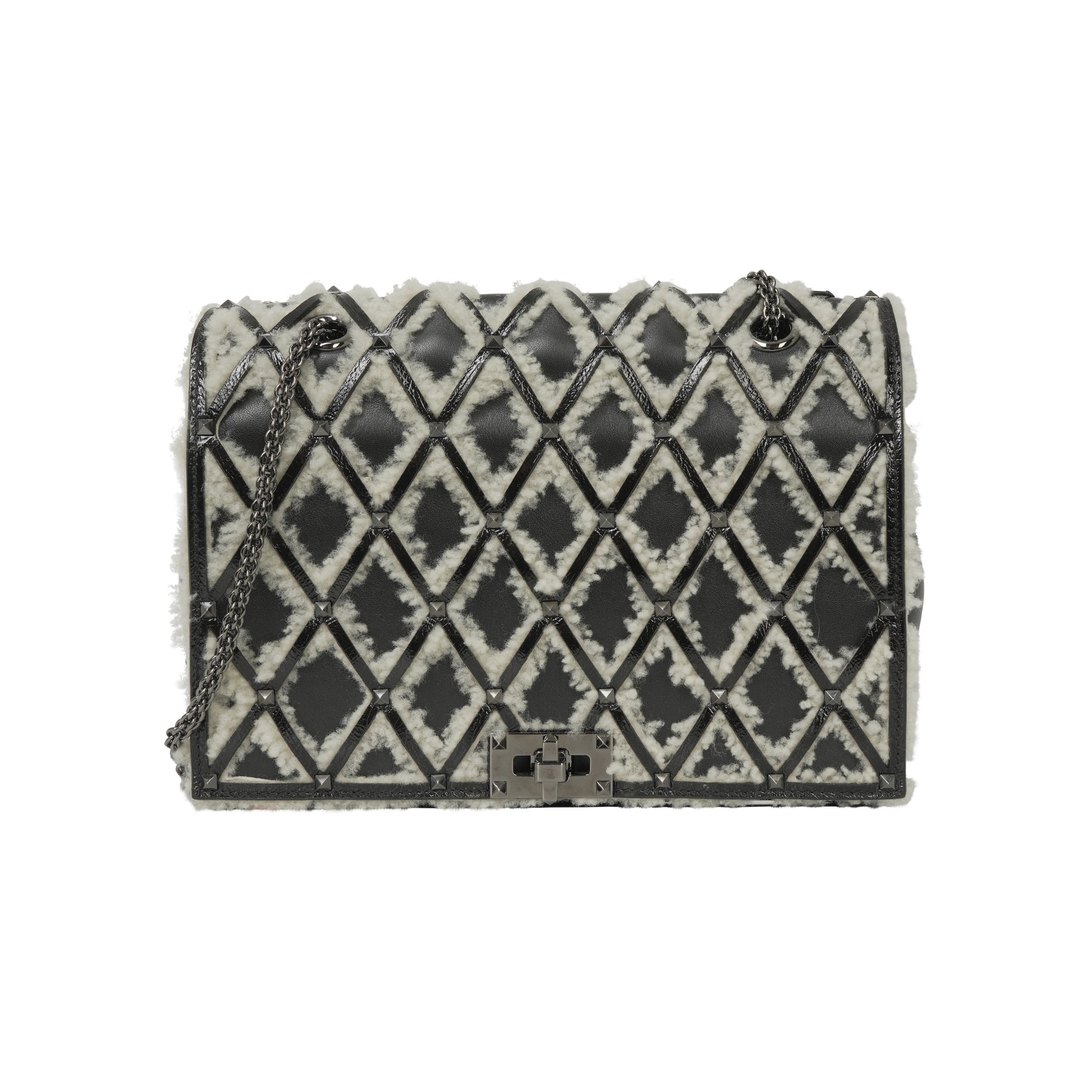 This iconic rockstud black bag has an exterior finish in lambskin with a zigzag pattern. It features a signature Valentino bag closure and a delicate shoulder chain.