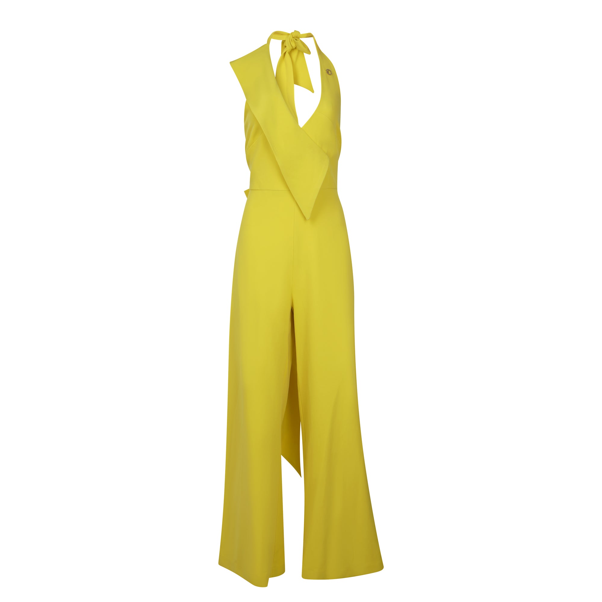 Yellow open back jumpsuit with crop jacket. Beautiful for a cocktail summer party.